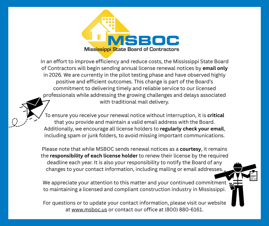 Beginning in 2026 MSBOC will rely solely on email to send annual renewal notices to current licensees approximately 60 days before the expiration date listed on the certificate of licensure. The notification will be emailed to the address of record on file with MSBOC. It is the responsibility of the license holder to renew a license annually and to notify MSBOC of any change in address. See below bulletin for more information.