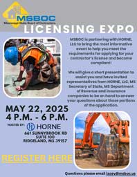 Topics include classifications of work, qualifications and experience, insurance requirements, financial requirements, business and law, as well as other need-to-know subjects. If you’re planning to apply for a Mississippi Contractor’s License, this workshop is sure to boost your confidence and understanding and give you a leg up over those who’ve not taken advantage of this valuable outreach resource.
